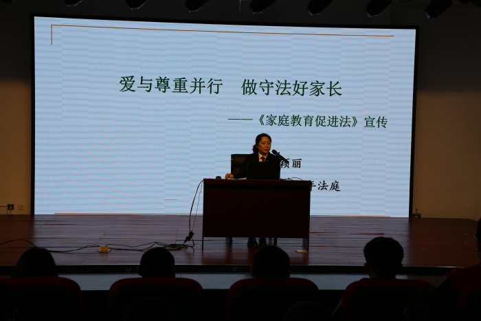 以“爱与尊重并行 做守法好家长”为题的给家长的一堂法治教育课,法制副校长为家长们讲解了青少年心理问题的严重性以及抑郁症的识别与应对,号召各位家长要关注青少年心理问题,与孩子建立良性的沟通,发现孩子出现了抑郁症的倾向及问题要及时寻求专业的帮助。同时为各位家长讲解了《家庭教育促进法》,该部法律的施行对家长如何科学的进行家庭教育提供了思路和方法,同时强调家长是家庭教育的第一责任人,引导家长重视家庭家教家风建设,培养全面发展的社会主义建设者和接班人。