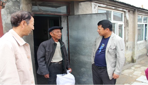 图为法院徐书记(左)与杨副院长(右)一同看望受灾五保户