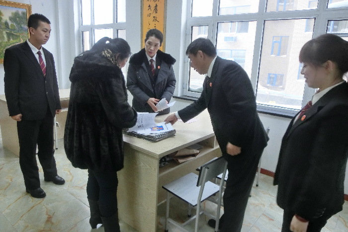 2014年12月3日下午,为了迎接首个全国宪法日,同江市人民法院开展了以“弘扬宪法精神,建设法治中国”为主题的活动,立案庭庭长张欣海同志带领全庭干警顶风冒雪来到了同江市兴旺社区进行普法送法活动,为全面贯彻党的群众路线精神,为社区送去了特制的宪法宣传手册和法律宣传单,并为社区图书馆捐赠了法制报纸与司法期刊,丰富了社区居民的精神文化生活的同时,也引导了广大人民群众对宪法的重新重视。