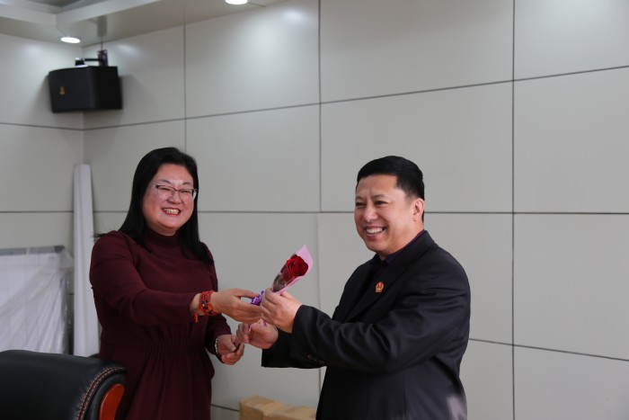 3月8日,为庆祝第108个三八国际妇女节,同江市人民法院召开“三八”妇女节座谈会,该院20余名女干警参加。会议由党组书记、院长雷阳主持,副院长孙锋、杨红军参加会议。在会上,雷阳同志代表党组成员向各位女同志献上鲜花并致以节日的问候。