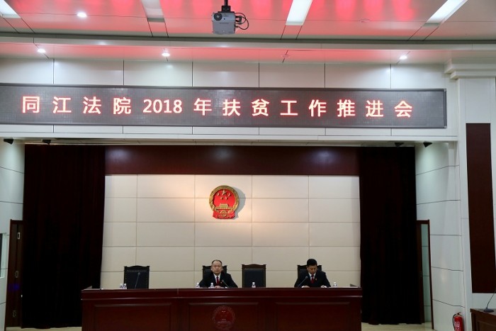 4月2日,为总结我院2017年脱贫攻坚工作,部署2018年重点工作任务,同江法院召开2018年扶贫工作推进会议。全体在编政法干警出席会议,雷阳院长、杨红军副院长主持会议。