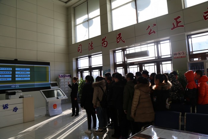 同学们都是第一次参观法院,显得既兴奋又好奇。在解说员的讲解和带领下,同学们先后参观了立案大厅、诉调对接中心、信访接待中心、刑事审判庭、被告人关押室等场所,切身了解了法院立案、审判、信访等各项职能,零距离感受法院的文化氛围。在参观刑事审判庭和被告人关押室时,讲解员结合身边真实案例,教育同学们远离犯罪,增强自身的法律意识,要学会运用法律武器保护自己。