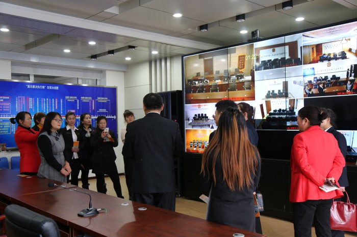 在党组成员、副院长张欣海和立案庭庭长邱洪玉的带领下,员工代表们参观了诉讼服务中心,讲解员介绍了各窗口的工作职能和立案程序,详细介绍了跨域立案和网上立案的办理程序。在执行指挥中心,员工代表们切身感受到了执行信息化建设成就,直观的感受到法院在解决执行难方面付出的努力和取得的工作成绩。
