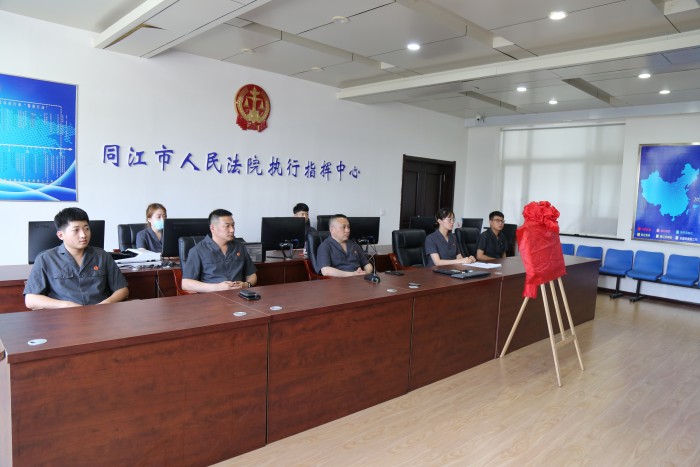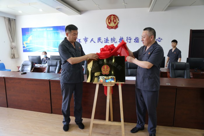 与会人员通过视频方式参加了省高院主会场举行的少年法庭揭牌仪式,按照会议要求,同江法院由王彦东与王金涛同步为少年法庭揭牌。